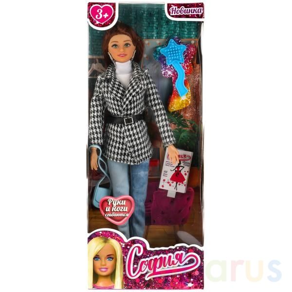 Модница-София одета в стильный пиджак с принтом «гусиные лапки», белую водолазку и джинсы. Образ куколки дополняют модные крупные серьги, ремень с крупной пряжкой и элегантная сумочка. Одежду и аксессуары легко снять и надеть. С такой модной куклой девочке будет интересно и весело играть: благодаря тому, что руки и ноги куклы подвижны, им можно придать любое положение. У Софии длинные красивые волосы, которые хозяйка куклы сможет заплетать в разные причёски. Детально проработанный дизайн игрушки вдохновит девочку на новые игровые сюжеты.