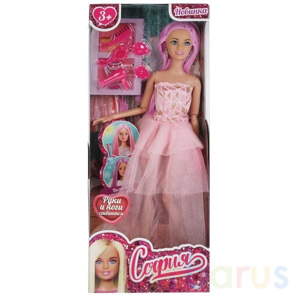 Модница-София одета в стильное розовое платье с ярусной юбкой из лёгкого фатина, образ дополнен изящными серьгами и сумочкой-клатчем. С такой модной куклой девочке будет интересно и весело играть: благодаря тому, что руки и ноги куклы подвижны, им можно придать любое положение. У Софии длинные красивые волосы, которые меняют свой цвет. Хозяйка куклы сможет заплетать волосы куклы в разные причёски. Детально проработанный дизайн игрушки вдохновит девочку на новые игровые сюжеты.