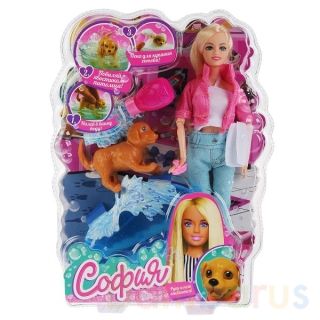 На Софии модная одежда: голубые джинсы, белый топ, розовая куртка и туфли (легко снять и одеть). Лицо куклы детально проработано. Руки и ноги куколки сгибаются (на шарнирах). Шелковистые длинные волосы Софии легко расчёсывать и создавать разнообразные причёски. Куклу и питомца можно купать.