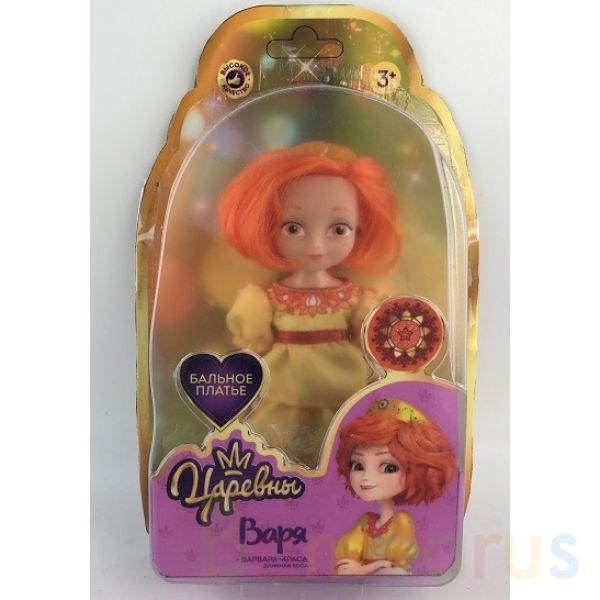 Варя одета в жёлтое бальное платье, украшенное поясом-лентой и декоративным воротником в оранжевой цветовой гамме. Голову куклы венчает корона. Одежду легко снять и надеть. Лицо куклы детально проработано. Густые шелковистые волосы куколки уложены в причёску-каре. Девочка сможет воссоздать сказочные сюжеты и придумать самые разнообразные сценки для игр.
