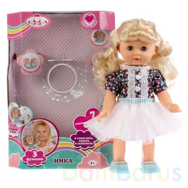 Интерактивная кукла «Ника» ТМ «Карапуз» представляет собой озвученную игрушку, которая произносит 25 фраз, рассказывает 2 стихотворения («С тобой мечтаю подружиться» и «Я модница, красавица») и поёт 5 замечательных детских песен: «Аленький цветок», «Если с другом вышел в путь», «Танец маленьких утят», «Песня принцессы» из знаменитого м/ф «Бременские музыканты», «От улыбки» из м/ф «Крошка Енот».