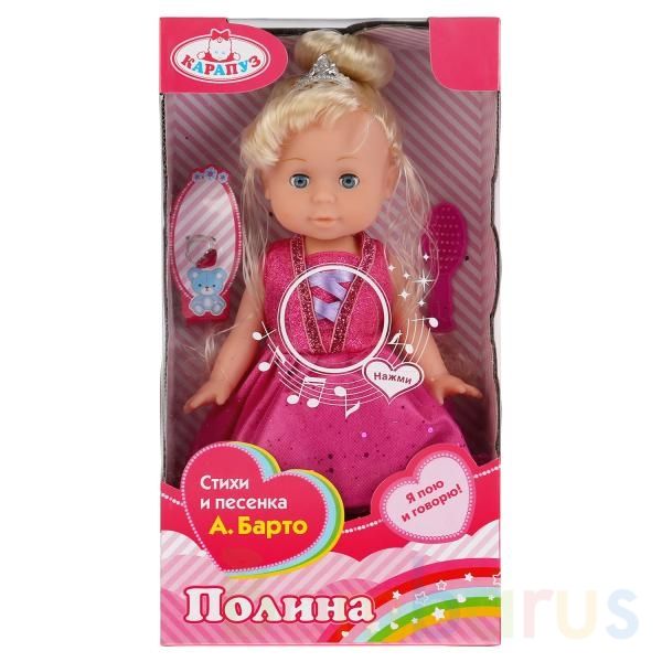 Эта милая куколка «Полина» с аксессуарами понравится любой девочке! Интерактивная кукла ТМ «Карапуз» - озвученная игрушка, которая рассказывает 3 стиха ("Бычок", "Зайка", "Мишка") и поёт песенку "Лошадка" А.Барто (нажмите кнопку на животике).