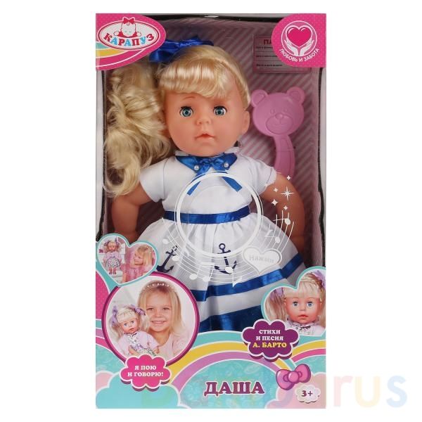 Интерактивная озвученная кукла «Даша» ТМ «Карапуз» непременно понравится вашей малышке:- рассказывает 3 стихотворения А. Барто: «Бычок», «Зайка», «Мишка»- поёт песню «Лошадка»- открывает и закрывает глазки- расчёска в комплектеКуколка одета в милое платьице в морском стиле и чудесные синие туфельки…