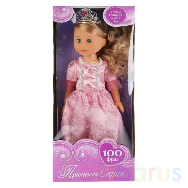 Интерактивная кукла «Принцесса София» ТМ «Карапуз» поёт песенку «Волшебный цветок» и произносит 100 фраз (нажмите кнопку на животике):