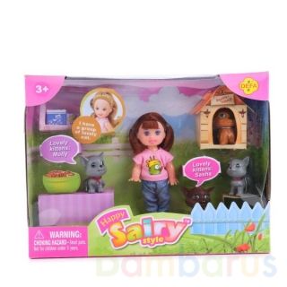 У куколки есть любимые питомцы: три кошечки и собачка.