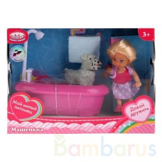 Машенька одета в модное платье и туфельки и болеро, которые легко снять и надеть. Длинные шелковистые волосы куколки легко расчёсывать, создавать красивые причёски, делая её образ очень стильным и неповторимым. С Машенькой и её питомцем можно купаться, брать их с собой на прогулку, в путешествие и весело играть, делая все девчачьи дела вместе!