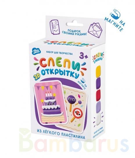 С помощью этого занимательного набора ваш ребёнок сможет самостоятельно создать объёмные открытки с милыми персонажами на магните. Когда пластилин застынет, открытки можно будет использовать для декора или в качестве подарка.