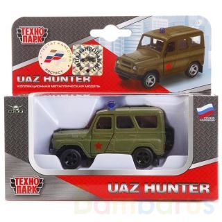 Металлическая машина "УАЗ HUNTER военный" является уменьшенной копией настоящего авто. Кузов модели выполнен из металла, окрашен в зелёный цвет с красной звездой на боку, передние двери открываются наружу. На кузове установлен сигнальный маячок, сквозь прозрачные стёкла можно рассмотреть детально проработанный салон. На колёсах надеты резиновые шины, которые плотно сцепляются с поверхностью. Автомобиль оснащён инерционным механизмом, благодаря чему способен дальше проезжать вперёд. Игрушка развивает фантазию, воображение, мелкую моторику пальцев. Она выполнена из качественного и прочного пластика и металла, прошедшего сертификацию для производства детских товаров. Длина машины: 8,5 см. Рекомендовано детям от 3-х лет.