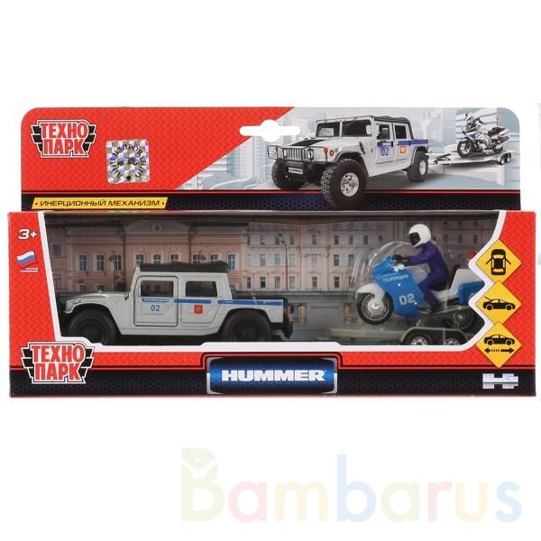 Коллекционная металлическая модель «Hummer H1. Полиция» с мотоциклом на прицепе ТМ «Технопарк» понравится маленькому защитнику правопорядка: