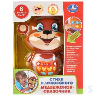 Яркий веселый медвежонок-сказочник расскажет 8 сказок и стихов К.И.Чуковского: Айболит, Мойдодыр, Муха цокотуха, Краденое Солнце, Телефон, Чудо-дерево, Путаница, Скрюченная песня На животике у мишки находятся кнопки, нажимая их, мишка расскажет сказки, стихи. Имеет световые эффекты. Можно регулировать громкость. Развивает зрение, память, осязание, воображение, мелкую моторику, слух, логику, кооординацию движений. Игрушка сделана из прочного высококачественного материала. Рекомендовано детям от 3-х лет. Работает от 3 батарейках типа АА (входят в комплект).
