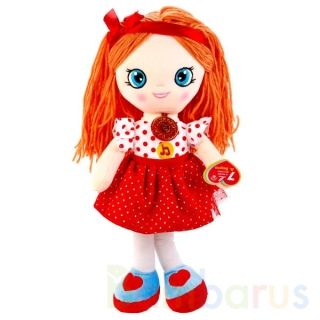Очаровательная куколка одета в красивое бело-красное платье в горох и мягкие туфельки. У неё длинные рыжие волосы, украшенные красной лентой. Игрушка очень мягкая на ощупь, ее приятно обнимать. Эта милая мягкая куколка станет для ребёнка хорошим другом, с которым можно придумать много новых сюжетов для игр.