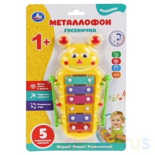 Металлофон в виде гусенички не оставит равнодушными малышей. На корпусе игрушки находится 6 пластинок радужных цветов, слегка ударяя по которым палочкой в комплекте, дети смогут извлекать звук разной тональности. Используя игрушку, можно научить ребёнка различать на слух звуки разной высоты, а также играть на ней простые мелодии.