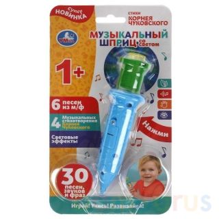 Маленькому любознайке непременно понравится эта необычная игрушка в виде шприца. Малыш с удовольствием будет слушать весёлые песенки из известных мультфильмов и интересные музыкальные стихи Корнея Чуковского. Благодаря компактному размеру игрушку удобно брать с собой.
