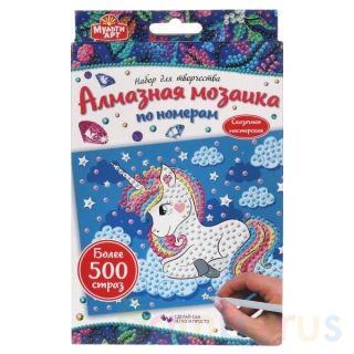 С помощью этого набора ребёнок сможет создать картину с изображением милого единорога в облаках, декорированную сверкающими стразами. Яркую поделку можно подарить или использовать для украшения комнаты.