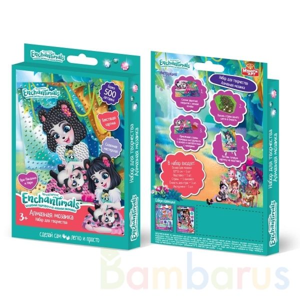 Набор для творчества – алмазная мозаика «Enchantimals. Прю Пандини и Нари» из серии «Сказочная мастерская» ТМ «Мульти Арт» станет прекрасным подарком для маленьких поклонниц мультсериала про волшебных подружек и их любимых зверюшек.
