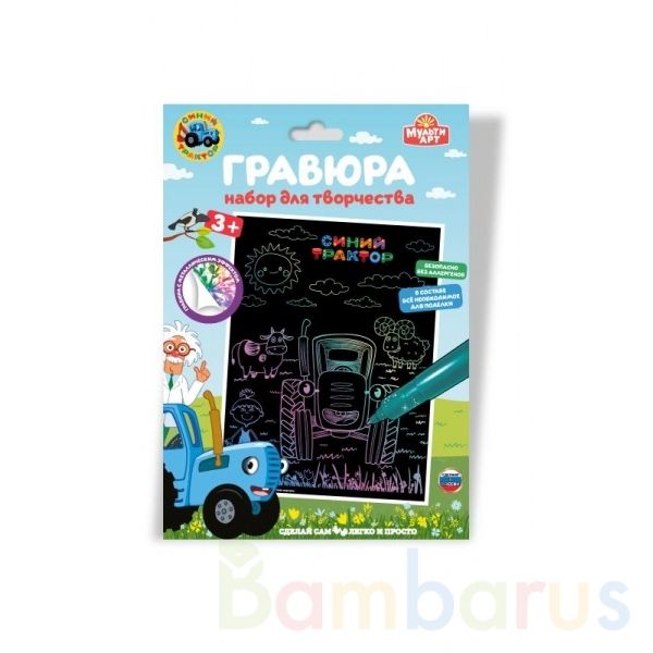 С помощью данного набора маленький поклонник мультсериала о Синем Тракторе сможет создать эффектную картину с изображением любимых персонажей. Контур рисунка уже нанесён на основу чёрного цвета, остаётся только процарапать изображение специальным штихелем. Готовую поделку можно подарить близким или использовать для украшения интерьера.