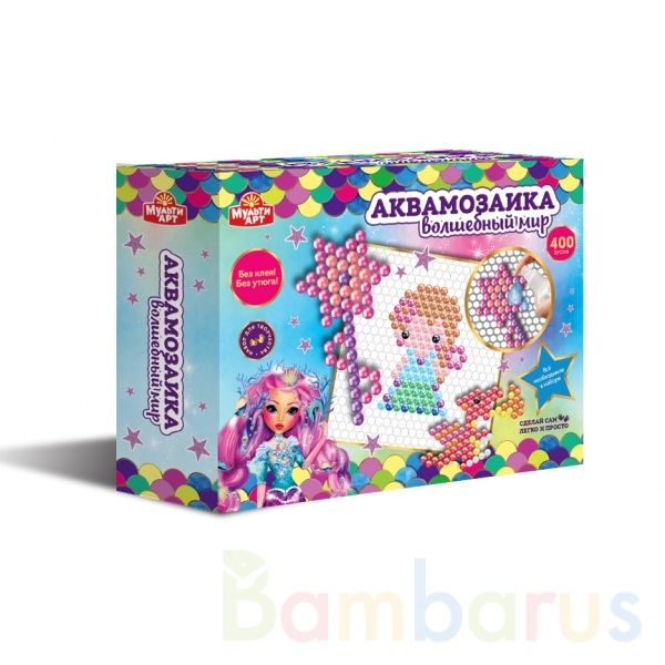 Набор для детского творчества «Аквамозаика. Волшебный мир» ТМ «Мульти Арт» - отличный подарок для развития творческих способностей вашего ребёнка:- 400 бусин- бусины скрепляются водой (без клея и утюга)- в комплекте всё необходимое: пластиковая основа, цветные бусины, карточки-шаблоны, распылитель …