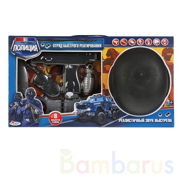 В борьбе за справедливость отважному герою обязательно пригодится набор 8 в 1 «Полиция. Отряд быстрого реагирования» ТМ «Играем вместе»:- пистолет- нож- наручники- рация- каска- свисток и др.В наборе есть всё, что может понадобиться настоящему полицейскому для проведения тайных операций!Пистолет и …