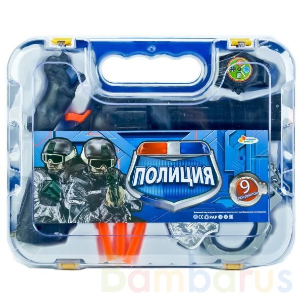 Игровой набор "Полиция" создан для маленьких борцов за справедливость, чтобы ловить преступников и наказывать врагов. Все предметы помещаются в прозрачный чемоданчик, который удобно всегда носить с собой. В общей сложности набор включает 9 предметов: пистолет, патроны, наручники и другие. Все они сделаны из безопасных материалов и предназначены для детей от 3-х лет.