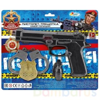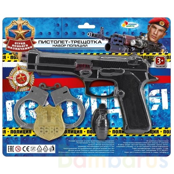 Игровой набор оружия «Полиция» ТМ «Играем вместе» станет прекрасным подарком для юных героев:- пистолет-трещотка- реалистичный дизайнВ комплекте:- пистолет- граната- наручники- значокС этим реалистичным игровым набором ребёнок будет придумывать увлекательные спецзадания, защищать мир и стоять на ст…