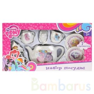 НАБОР ПОСУДЫ "ИГРАЕМ ВМЕСТЕ" "MY LITTLE PONY", КЕРАМИКА 7 ПРЕДМ. В РУСС. КОР. в кор.60шт Игровой набор посуды My Little Pony от компании "Играем Вместе" выглядит, как настоящий сервиз для чаепития. Он состоит из 7 предметов, изготовленных из керамики. На белом фоне нанесены веселые узоры и изображения очаровательных персонажей из одноименного популярного мультфильма. Чайный набор рассчитан на две персоны. В нем предусмотрена также сахарница и молочница. Комплект окрашен яркими и очень устойчивыми красителями, которые позволяют ему сохранять свой первоначальный вид. Такой набор порадует поклонниц мульфильма. Рекомендовано детям старше 3-х лет.