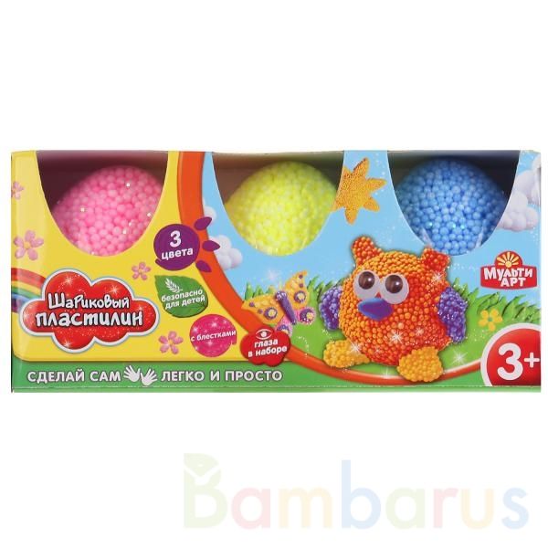 Набор для творчества «Шариковый пластилин с блёстками» ТМ «Мульти Арт» для маленьких фантазёров и творцов.Комплектация: - 3 упаковки шарикового крупнозернистого пластилина разных цветов- 1 пара глазОсобенности:- не липнет к рукам- безопасный - крупные зёрна с блёстками отлично сцепляются между собо…