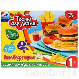 Набор тесто для лепки MultiArt Гамбургеры (5 цв.теста*30 гр., нож, валик, тарелка, 2 бол.формы) в русс. кор. в кор.2*24шт Тесто для лепки "Гамбургеры" - это набор для творческого и активного ребёнка. В него входит: 5 брусочков теста разных цветов по 30 г, нож, валик, тарелка и 2 большие формы. Материал мягкий и приятный на ощупь, из него просто делать различные фигурки и создавать свои кондитерские изделия. В состав входят только натуральные компоненты и пищевые красители, поэтому тесто абсолютно безопасно для детей. Рекомендуется для ребёнка от 1-го года.