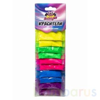 В набор входит 10 пакетиков с красителями 5-ти цветов (каждого по 2 пакетика), которые при добавлении в прозрачный слайм сделают его ярким и красочным. Сделанный своими руками оригинальный слайм, декорированный такими интересными деталями, станет любимой игрушкой ребёнка.