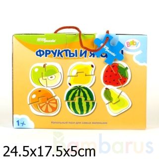 Задача ребёнка – правильно подобрать детали из набора, чтобы собрать картинки с изображением разных видов фруктов и ягод - яблока, лимона, клубники, апельсина, арбуза и груши. Благодаря небольшому количеству деталей, малыш без труда сможет выполнить задание, с каждым разом делая это всё лучше и быстрее. Пазл можно собирать прямо на полу.