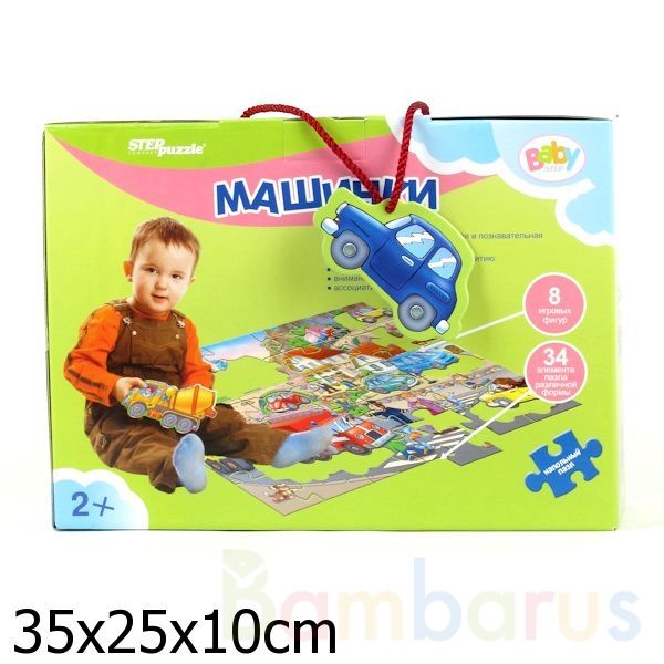 Напольный пазл «Машинки» - отличная развивающая игра для малышей.Особенности и комплектация:- 34 элемента пазла различной формы- 8 игровых фигур- размер собранной картины: 96 х 68 см- красочный дизайнЗадача ребёнка – правильно подобрать детали из набора, чтобы собрать большую картинку с изображение…