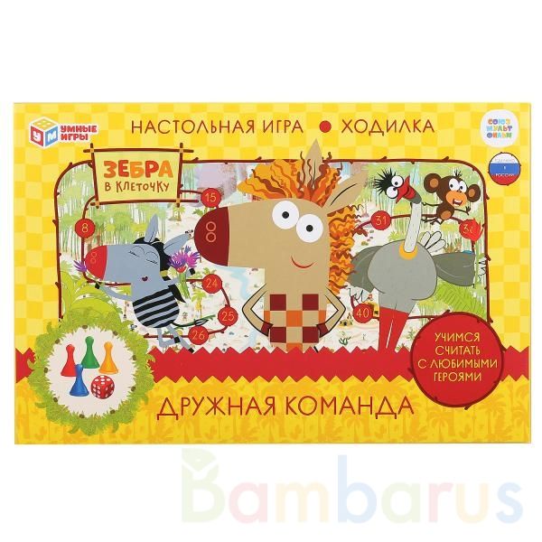 Настольная игра-ходилка «Зебра в клеточку. Дружная команда» ТМ «Умные игры» – это увлекательное путешествие в мир цифр вместе с героями из одноимённого мультфильма.