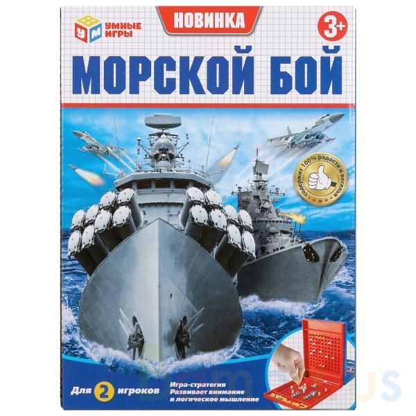 Морской бой является одной из самых популярных настольных игр уже долгие годы. Её цель - первым затопить все корабли противника. В набор входят 2 поля красного и синего цвета, 10 кораблей для каждого из игроков, специальные метки. Называя по очереди координаты удара, игроки пытаются угадать местоположение флота друг друга, отмечая промахи и попадания. Эта игра учит ребёнка внимательности, способствует развитию стратегического мышления, концентрации, усидчивости. Все материалы безопасны для использования. Рекомендуется детям не младше 3-х лет.