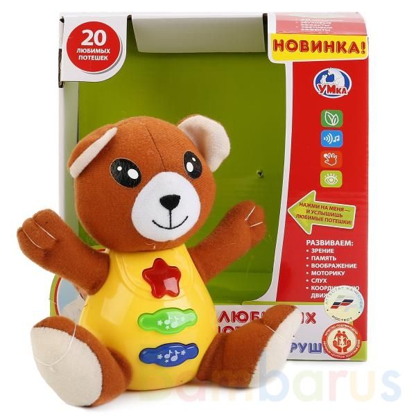 Обучающая игрушка "Медведь" торговой марки "УМКА" предназначена для раннего развития детей от 1 года. На мишке 3 кнопки, нажав на которые ребёнок услышит 20 любимых потешек. Корпус игрушки из твёрдого пластика, а голова, руки и ноги медведя мягкие. Игрушка рекомендована психологами и имеет 6 развивающих функций: тренирует зрение, память, воображение, слух, мелкую моторику и координацию движений. Качество подтверждено аттестатом Ростест.