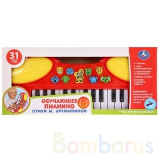 Детское пианино "УМКА" — это развивающая игрушка, которая поможет раскрыть музыкальные способности ребёнка. 24 клавиши имеют два режима работы. В первом режиме ребёнок сможет прослушать заложенные в маленькое пианино песни, потешки и стихотворения, а во втором — изучить ноты и попробовать сочинить собственную мелодию. В детское пианино заложено 14 русских потешек, 9 песен из мультфильмов и 8 стихотворений М. Дружининой. Игрушка развивает музыкальный слух, память, мелкую моторику рук, фантазию. Работает от 3 батареек типа АА.