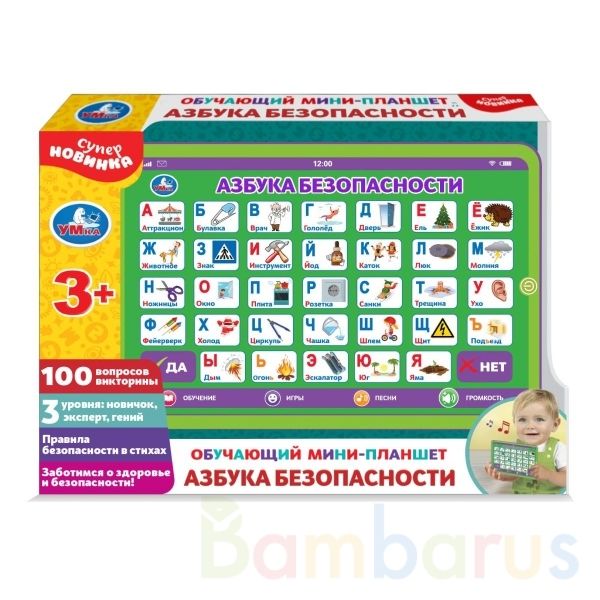 Обучающий мини-планшет «Азбука безопасности» ТМ «УМка» станет прекрасным подарком для маленького любознайки:- 3 песни из м/ф: «Песенка Мамонтёнка», «Весёлая карусель», «Кабы не было зимы» - 100 вопросов викторины- 3 уровня сложности: «новичок», «эксперт», «гений»- правила безопасности в стихах- заб…