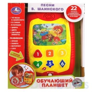 Музыкальный планшет ТМ «УМка» - уникальная новинка с песнями В. Шаинского которая порадует малышей и взрослых. Спереди у планшета есть разноцветные кнопки разной формы. Нажми на них и они воспроизведут:- 10 песен В. Шаинского;- 6 стихов;- 6 потешек;- цвета;- световые эффекты.Играя с планшетом ТМ «У…
