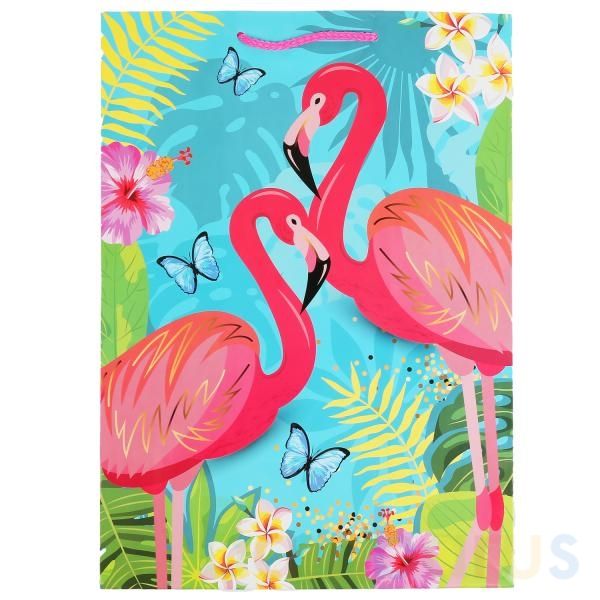 Красочный пакет, с изображением ярко-розовых фламинго в окружении цветов и бабочек, принесёт ребенку радость предвкушения. Ему будет интересно заглянуть в него, чтобы узнать, что же приготовили родные или друзья на день рождения или на любой другой праздник.
