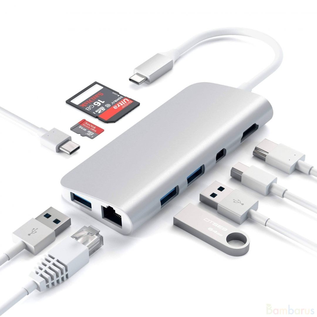 Переходник Satechi Aluminum. Порты USB Type-C Power Delivery (49W), 3хUSB, 4K HDMI (30Hz), 4K mini DisplayPort (30Hz),micro/SD (Серебряный)