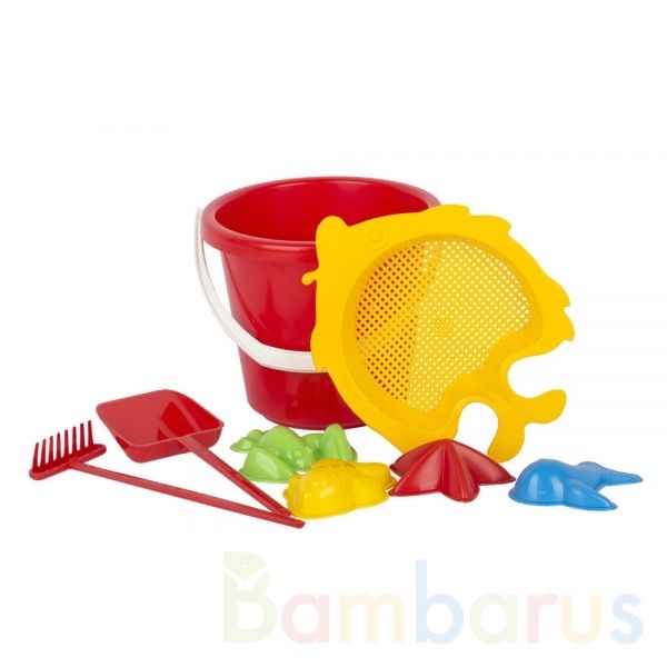 В наборе сразу 8 предметов для игр вашего ребёнка: грабельки, лопаточка, 4 формочки для песка, ситечко-рыбка, большое ведро.