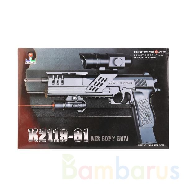 Такой пистолет будет отличным подарком будущим защитникам отечества. Посмотрите, как он похож на настоящий! Он оснащён лазерным и оптическим прицелом, чтобы помочь прицелиться малышу. С такой игрушкой ваш малыш будет самым метким стрелком. Такие игрушки пригодятся для воспитания патриотизма в детях, помогут развить внимательность и меткость. Товар сертифицирован. Рекомендуется для детей старше 6 лет.