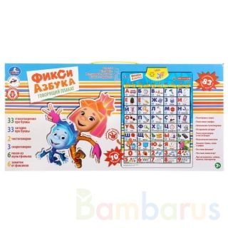 Говорящий плакат "Фикси азбука" - это уникальный и многофункциональный помощник малышу. На нём изображены клеточки с буквами и рисунками разных предметов, которые начинаются на эту букву. У плаката есть звуковой модуль с динамиком, кнопки включения и выключения, регулировки громкости. Для развития ребёнка разработаны 10 обучающих программ и 5 режимов проверки знаний, воспроизводятся 33 стихотворения про буквы, 33 загадки про цифры, 2 чистоговорки, 3 скороговорки, 6 песен из мультфильма и 6 заметок от Фиксиков. Плакат служит для обучения, развивает память, внимательность, слух в игровой форме. Работает от 3 батареек типа АА, в комплект не входят. Рекомендовано для детей от 3 лет.