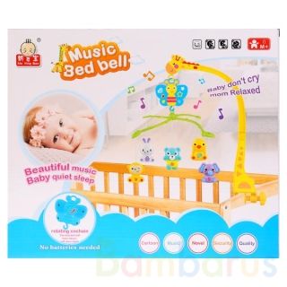Музыкальная погремушка с милыми игрушками на подвеске станет любимой забавой малюток с рождения. Мобиль надёжно крепится на кроватку, люльку или коляску. Его центральная часть выполнена в виде цветной бабочки на лепестках, к которым крепятся верёвочки с яркими фигурами зверей. Всю композицию дополняет сказочный жираф, который является креплением и держателем подвижной части погремушки. Игрушка легко вращается и издаёт мелодичную приятную музыку.