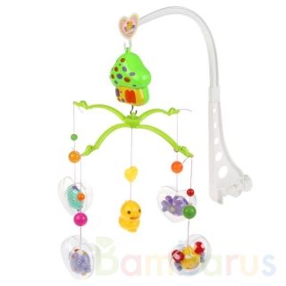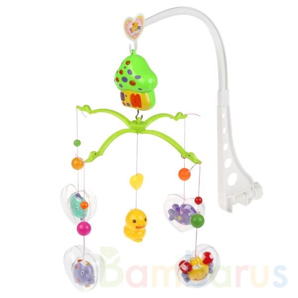 Мобиль надёжно фиксируется на кроватку, люльку или коляску при помощи винтового крепления. Его центральная часть выполнена в виде домика, к которому крепится карусель с яркими фигурами погремушек в прозрачных сердцах. Игрушка легко вращается и издаёт мелодичную приятную музыку.