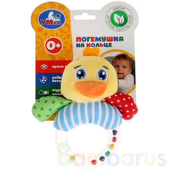 Цыплёнок станет новой, любимой игрушкой малыша. Она выполнена из мягкого, прочного, гипоаллергенного материала в ярких радужных цветах. Кроме мягкой части у погремушки есть прозрачная ручка из пластмассы, внутри которой находятся маленькие разноцветные шарики. Во время игры с погремушкой звуки гремящих шариков привлекают внимание малыша и успокаивают его. Кольцо из качественной пластмассы также подходит как безопасный прорезыватель для малыша, когда у него появляются зубки.