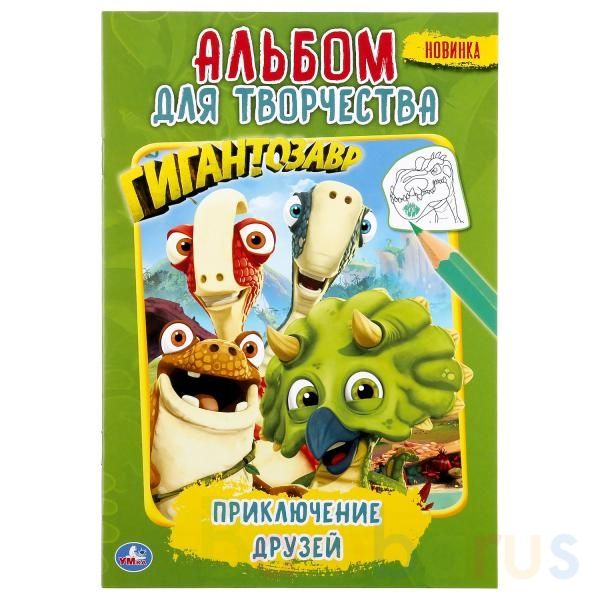 Альбом для творчества «Гигантозавр. Приключение друзей» из серии «Первая раскраска» ТМ «УМка» приглашает детей порисовать: