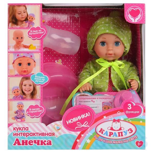 Интерактивная кукла «Анечка» ТМ «Карапуз» совсем как настоящий ребёнок.Функции 4 в 1:- пьёт из бутылочки- писает в горшок - закрывает глазки - можно купатьНа Анечке: нарядный комбинезон, тёплая кофта и шапочка (легко снять и надеть). Лицо куклы детально проработано.Игра с интерактивной куколкой учи…