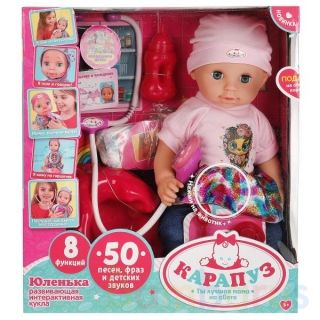 Развивающая интерактивная кукла «Юленька» ТМ «Карапуз» станет прекрасным подарком для вашего ребёнка:- поёт 10 песен: «Разукрасим все планеты» (Барбарики), «Волна» (Барбарики), «Бананамама» (Барбарики), «Мамочка» (Волшебники двора), «Лялечка» (Волшебники двора), «Изумрудный город», «Облака», «Вмест…