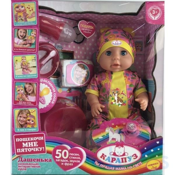 Интерактивный пупс «Дашенька» ТМ «Карапуз» станет замечательным подарком для вашей принцессы:- воспроизводит 50 звуков, песен, стихов, загадок и фраз- боится щекотки- ходит на горшок- пьёт из бутылочки- перестанет плакать, если дать соску- подарок на обороте коробкиВ комплекте:- интерактивная соска…