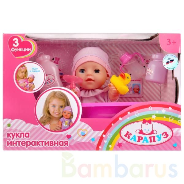 Интерактивная кукла с аксессуарами ТМ «Карапуз» станет замечательным подарком для маленькой принцессы:- пьёт из бутылочки- ходит на горшок- открывает и закрывает глазки- можно купатьВ комплекте:- ванночка- уточка- шампунь (имитация)- присыпка (имитация)- соска- бутылочкаКарапуз одет в боди нежно ро…