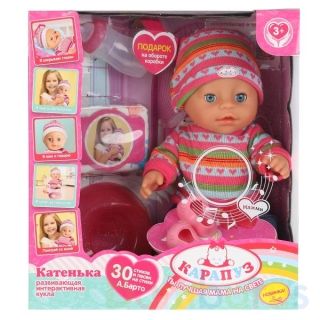 Развивающая интерактивная кукла «Катенька» ТМ «Карапуз» станет прекрасным подарком для вашего ребёнка:- 30 стихотворений и песен на стихи А. Барто- пьёт из бутылочки- ходит на горшок- закрывает глазкиВ комплекте:- горшок- соска- бутылочка- подгузник- ботиночкиЭтот милый пупс, с детально проработанн…
